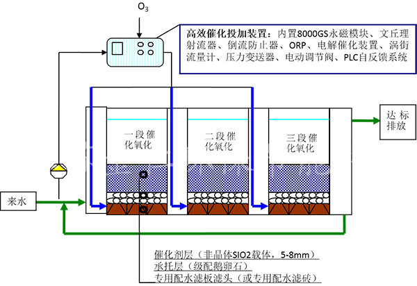 通過高效催化投加裝置后的臭氧和水的混合液,由增效噴嘴進入專業(yè)設(shè)計的氣水分配濾磚均勻進入貴重金屬的催化劑層,催化劑表面具有外墻電位,有效的激發(fā)產(chǎn)生羥基自由基,羥基自有基的氧化還原電位為E0=2.8ev,在如此高的氧化電位的作用下大部分難降解的有機物發(fā)生斷鏈反應(yīng)形成短鏈的有機物或直接被氧化至CO2和H2O,最終出水可達設(shè)計排放標準。永磁高級催化氧化系統(tǒng)的工藝流程如下所示: